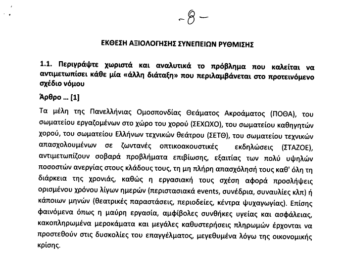 Η κατάθεση της τροπολογίας από το Υπουργείο Εργασίας με την οποία προτείνεται η τροποποίηση της παρ. 1 του άρθρου 22 του ν. 1836/1989 (Α΄ 79), προκειμένου το ειδικό εποχικό βοήθημα να παρέχεται και σε όσους ασκούν το επάγγελμα του χορευτή ή του τεχνικού απασχολούμενου σε ζωντανές οπτικοακουστικές εκδηλώσεις, εφόσον είναι μέλη του οικείου κλαδικού ή ομοιοεπαγγελματικού σωματείου τους, έρχεται να διορθώσει μια αδικία χρόνων και να ικανοποιήσει ένα χρόνιο αίτημα των εργαζομένων. Η Πανελλήνια Ομοσπονδία Θεάματος-Ακροάματος χαιρετίζει τη νομοθετική αυτή πρωτοβουλία και αισθάνεται δικαίωση για τις μακροχρόνιες προσπάθειές της. Τα υψηλά ποσοστά ανεργίας, η εργασιακή επισφάλεια, η περιστασιακή απασχόληση, η μεγάλη καθυστέρηση της καταβολής των δεδουλευμενων ειναι μερικές από τις δυσκολίες που αντιμετωπίζουν αυτοί οι εργαζόμενοι, δυσκολίες που έχουν μεγεθυνθεί, λόγω της οικονομικής κρίσης.
